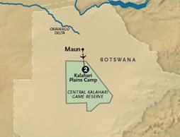 Day 2 - Desert Safari!At the core of the vast Kalahari Desert, the Central Kalahari Game Reserve is one of the largest protected areas on the continent. Amidst its sweeping vistas of acacia savannah and scrub-covered dunes, a fascinating spectrum of plants and animals have successfully adapted to living in these harsh conditions. Impressive herds of springbok, wildebeest and gemsbok are constantly foraging for food as predators stalk their next meal. These carnivores encompass small mammals like the Cape fox and honey badger as well as hyena, cheetah and the magnificent black-maned Kalahari lion! In addition to today’s game drives and nature walk, spending time with San Bushmen offers insight into their unique culture. Meals B+L+D